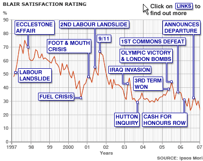 As the graph shows, Blair is not leaving on a high. Can you remember the Ecclestone affair of 1997, a foretaste of the spin and party funding crises that later engulfed his premiership, when he was accused of granting favours to Formula One boss Bernie Ecclestone – exempting the sport from a tobacco ad ban – in exchange for a £1m Labour donation?