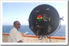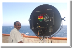 While my cruise mates were busy topping up their tans or playing deck quoits, I joined the guard pictured here to keep watch and protect them against any threat of piracy. This sophisticated sonar tracking device would have detected the presence of unwanted predators nearby.